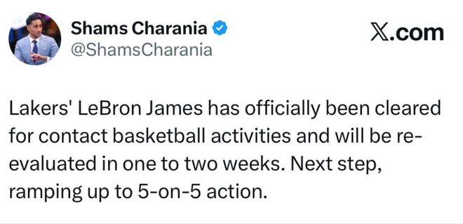 今天,来自Shams的权威消息,詹姆斯已获准参加5VS对抗训练,1-2周后将重新评估伤情。