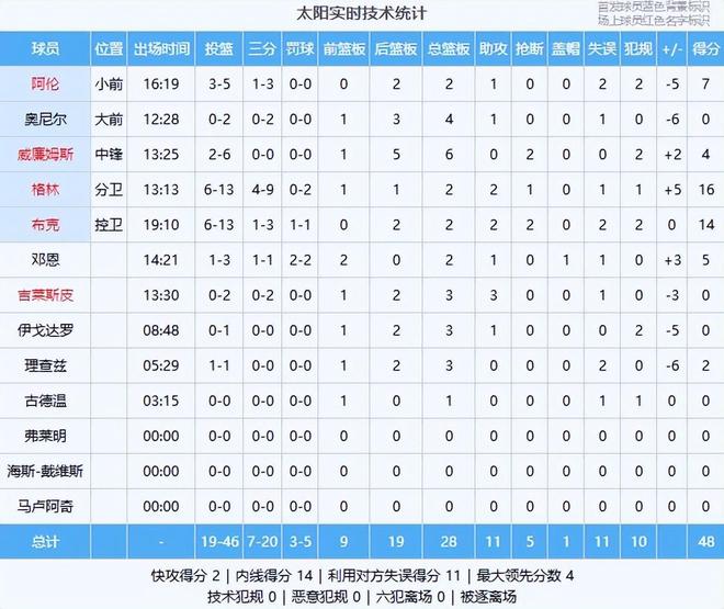 太阳:格林16分2板2助、布克14分2板2助2断、阿伦7分2板1助、邓恩5分2板1助、威廉姆斯4分6板2断、理查兹2分3板、奥尼尔4板1助、吉莱斯皮3板3助、伊戈达罗3板1助、古德温1板