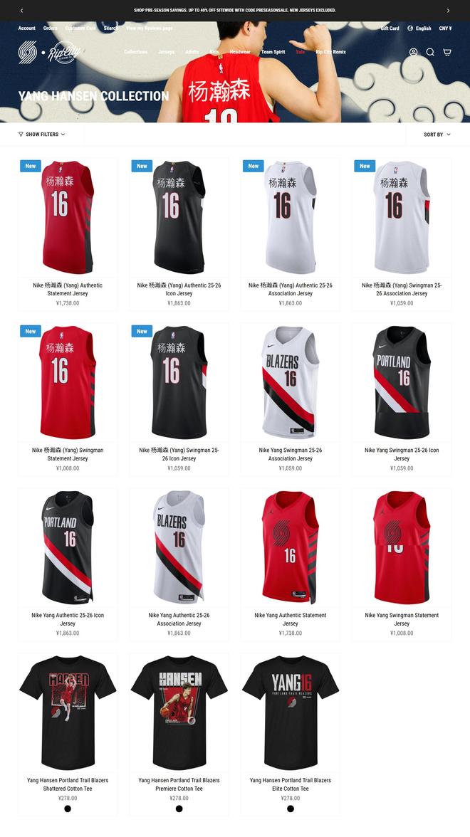 北京时间今日,波特兰开拓者官方商城上线了杨瀚森的中文版球衣,商城首页也对应换成了杨瀚森的照片。